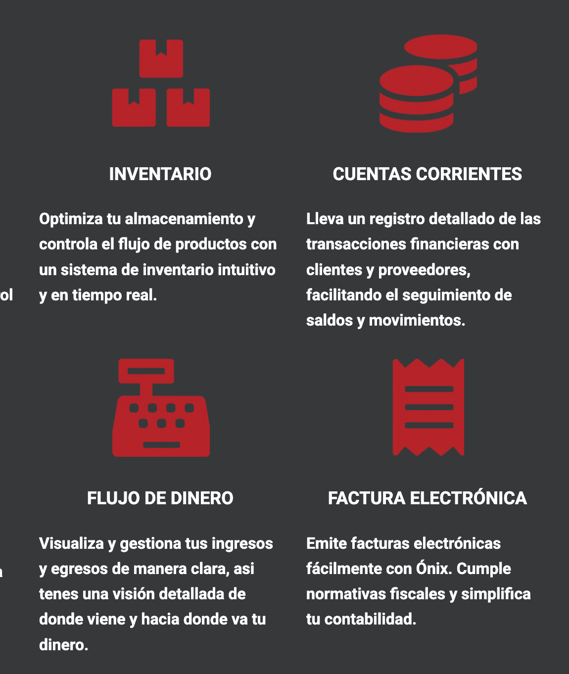 Includes responsive design, SEO optimization, service presentation for sales, purchases, inventory, cash-flow and electronic invoicing, with a streamlined user experience for small and medium businesses.
